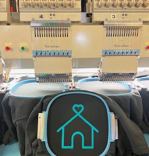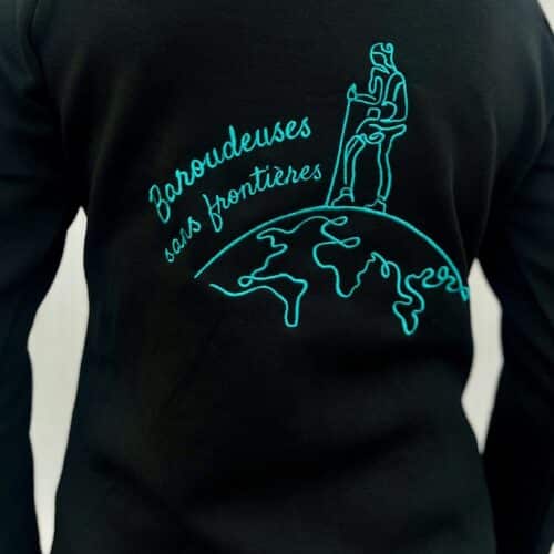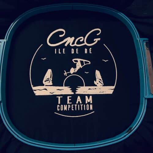 Réalisation d’une broderie à l’arrière du pantalon, au niveau du mollet, pour Climb With Us.