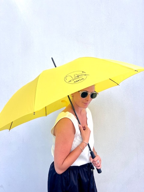 Réalisation de parapluies jaunes avec impression noire, aux couleurs emblématiques de La Rochelle.